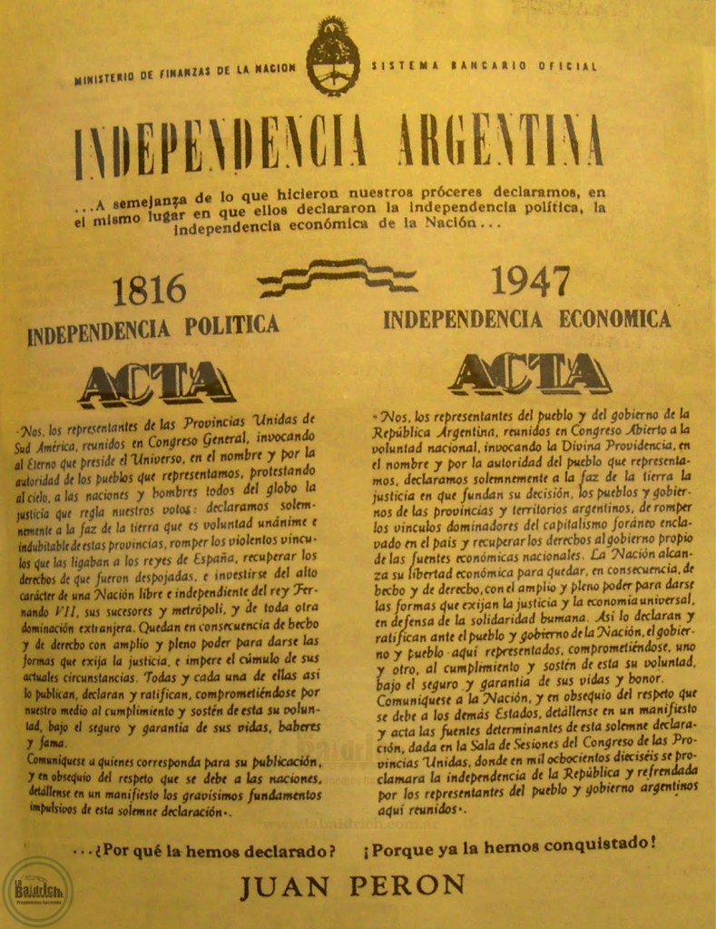 Que diferencia abismal con el contenido del Acta de la Declaración de la Independencia Económica, ocurrida el 9 de Julio del Año 1947 en la misma ciudad, con las rúbricas de Juan H. Quijano, Angel Borlengui, Juan A. Gramuglia, Miguel Miranda, Juan Pistarini y Ramón Carrillo entre otros, donde se puede leer lo siguiente: