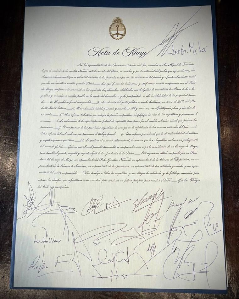En la ciudad de San Miguel de Tucumán, este 9 de Julio se firmó el tan anunciado Pacto de Mayo. En primer término estampó su firma el Presidente de la Nación, le siguieron, Bartolomé Abdala, Martín Menem, Karina Milei y a continuación el Jefe de Gobierno de C.A.B.A. y los diecisiete Gobernadores, que brindaron su apoyo a este Nuevo Pacto Colonial.