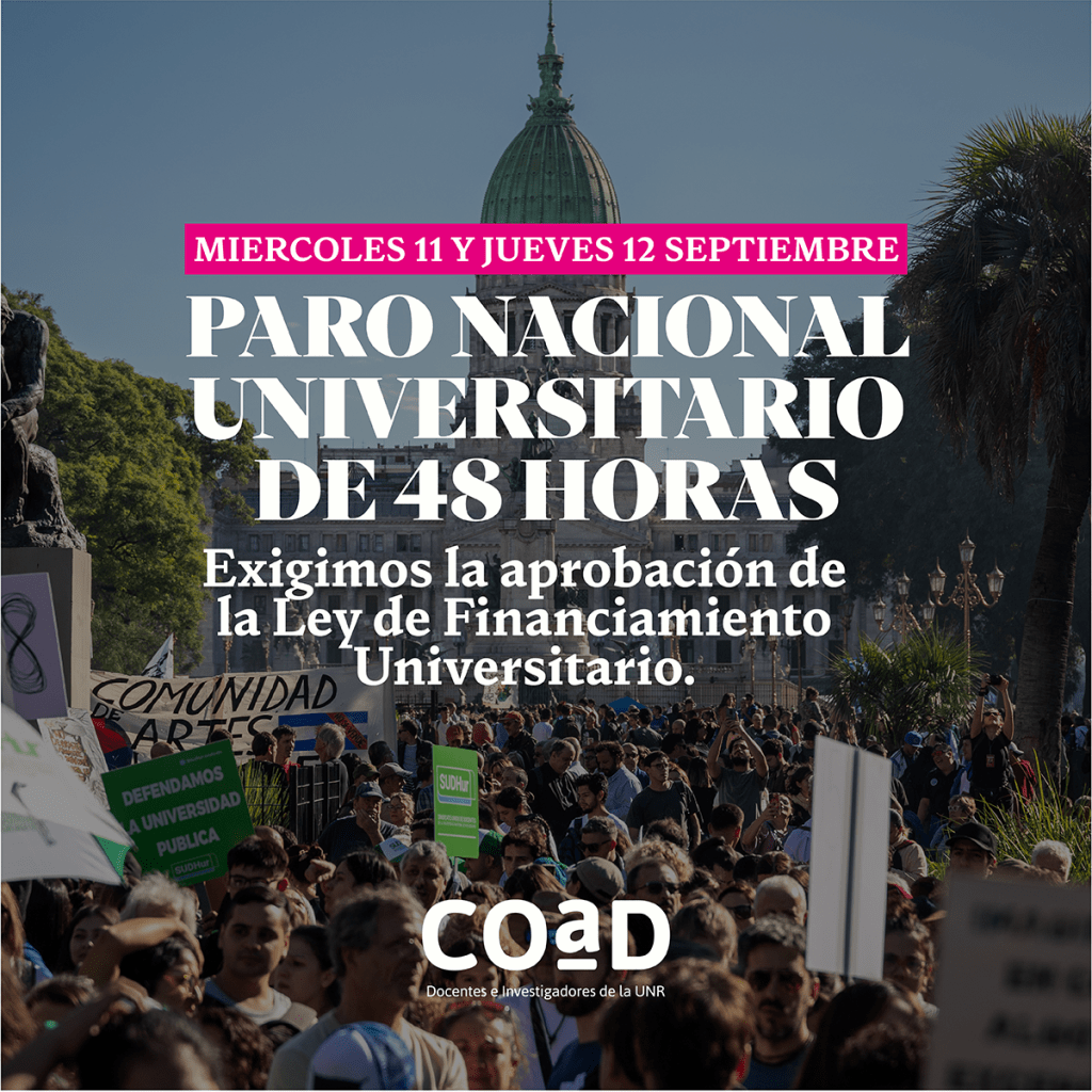 El dia Lunes 9 de Septiembre, el Consejo Directivo y el Congreso de Delegadxs de la COAD resolvieron convocar a un paro de 48 horas para los días Miércoles 11 y Jueves 12 de Septiembre. La medida de fuerza se enmarca en el plan de lucha nacional que tiene como demanda más inmediata la sanción de la Ley de Financiamiento Universitario que tendrá tratamiento el Jueves 12 en el Senado de la Nación.