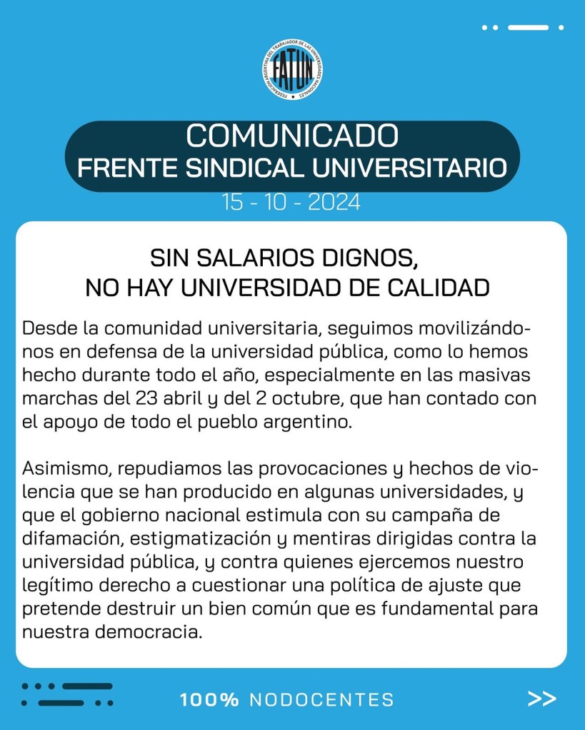 De esta manera, sigamos en Unidad, Solidaridad y Organización levantando nuestra voz, en contra de la política de ajuste del Gobierno Nacional que solo compromete el futuro de todas y todos.