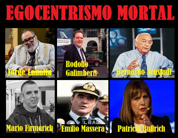 Creo que personajes como Jorge Lanata, Bernardo Neustadt, Gorriaran Merlo, Eduardo Firmerich, Rodolfo Galimberti, Patricia Bulrrich, el Almirante Eduardo Massera han tenido esa impronta egocéntrica y narcisista totalmente carente de valores ético-morales y empatía sobre los demás, hicieron lo que les satisfizo según sus intereses y vanidades sin importar cambiar de banderías políticas ni el daño social que ocasionaban con su accionar, sin importar a quien servían y a quien dañaban ya que en su mundo solo ellos son humanamente significativos e importantes, los demás no cuentan.