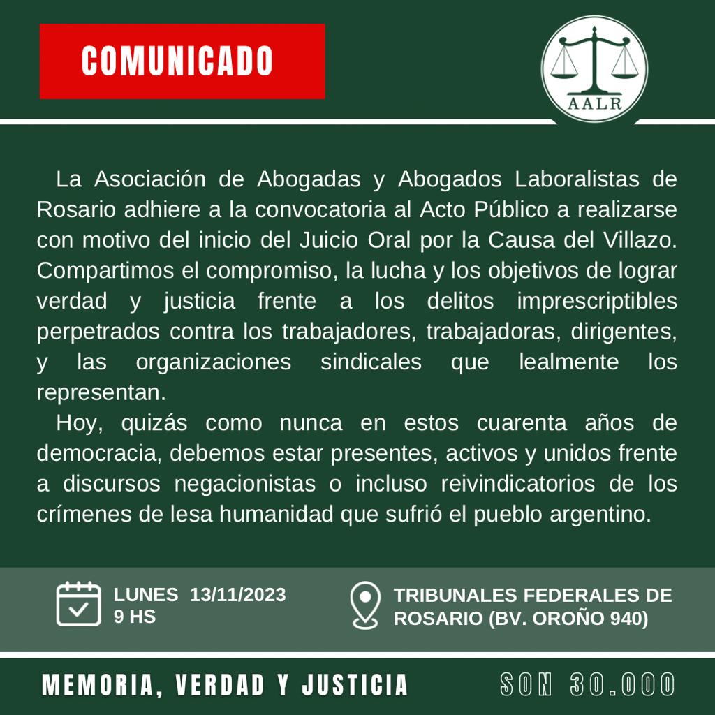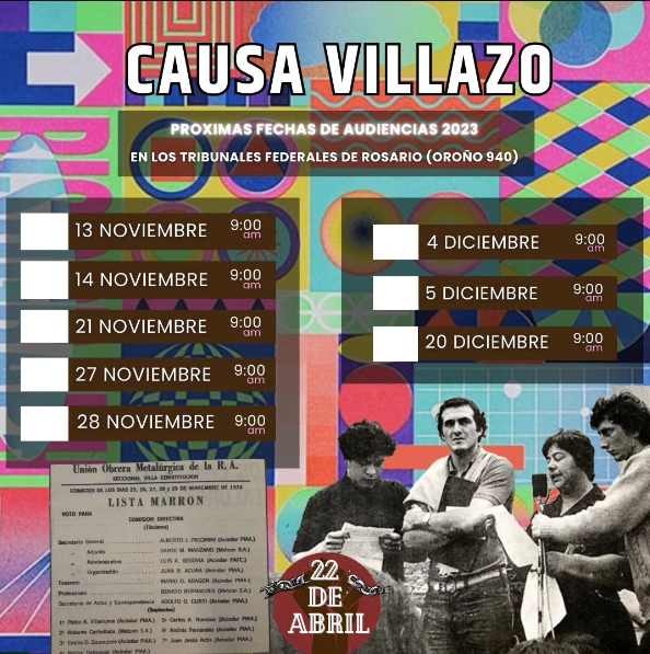 El Lunes 13 de Noviembre inicia la «CAUSA VILLAZO», en la que se Juzga el Genocidio realizado durante los años 1975 y 1976 en la ciudad de Villa Constitución. Estos crímenes ya fueron definidos por los Tribunales Federales de Rosario como de lesa humanidad.