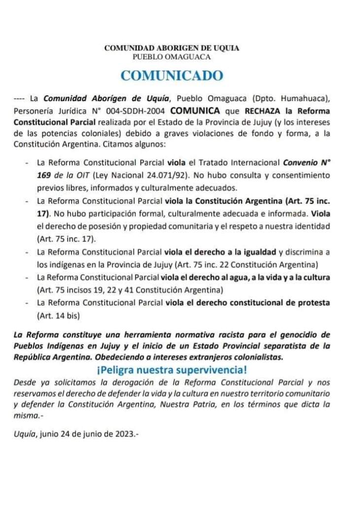 En este contexto, el Gobierno Radical de Jujuy, a cargo de Gerardo Morales, con la Complicidad de la Mayoría de los Electos por el Justicialismo de esa Provincia, sancionó entre gallos y medianoche una Nueva Constitución, el último 20 de junio, que intenta aggiornar aún más las condiciones legales para facilitar los negocios en torno a la Minería entre otros objetivos. 6 legisladores del F.I.T. y 2 Justicialistas se retiraron de la Convención Constituyente para no convalidarla. El sector del peronismo que se opone no es un sector menor –a pesar de tener hoy menos constituyentes-, ya que encabezó en 2019 las elecciones de legisladores nacionales que ganó, el mismo año que Morales ganaba las provinciales, frente a un justicialismo dividido.