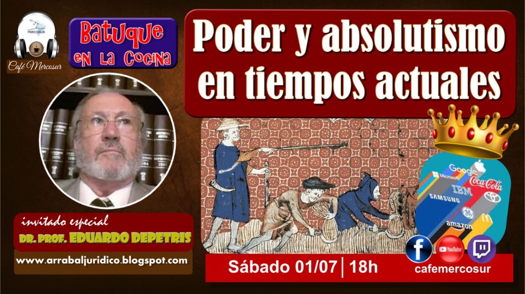 HOY EN CAFE MERCOSUR, estamos con el Doctor y Profesor de Derecho Eduardo Alfonso Depetris (http://arrabaljuridico.blogspot.com/). Charlaremos acerca de la Naturaleza del Poder y cómo éste va cambiando en la Actualidad Neoliberal, para acercarse a nuevas formas que se asemejan a un Totalitarismo Moderno. Participa del encuentro el Profesor y Comunicador Social Sergio Rubén Rossi de la Revista Digital «De Puño y Letra» (depunoyletraweb.com). Además hablaremos de otros temas de la Realidad Política de la Patria Grande.