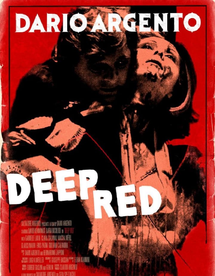 «Rojo Profundo» inaugura una forma de hacer Cine, el Cine donde el terror sanguinario va de la mano del terror psicológico. Una vidente alemana advierte una presencia extraña mientras da una conferencia sobre Parapsicología. La vidente a la noche es asesinada brutalmente en su casa. «Rojo Profundo» es un filme que lleva al giallo italiano a su máxima expresión. Ese terror donde el slasher es la sexploitation del misterio y suspenso pero todo con mucha sangre y violencia. Es el típico thriller ampuloso, manchado de rojo y donde la cámara apunta a la sangre para crear terror y asco. En «Profundo» Argento elige a un actor inglés por su perfil y su rostro, David Hemmings fue el que hizo de Blow-up de Antonioni una película de culto del cine italiano. Todos recordamos a ese personaje del fotógrafo del filme fundamental del cine italiano de los sesenta. En el filme de Argento Hemmings interpreta a un pianista y junto a la bella Daría Nicolodi investigan ese asesinato sangriento.
