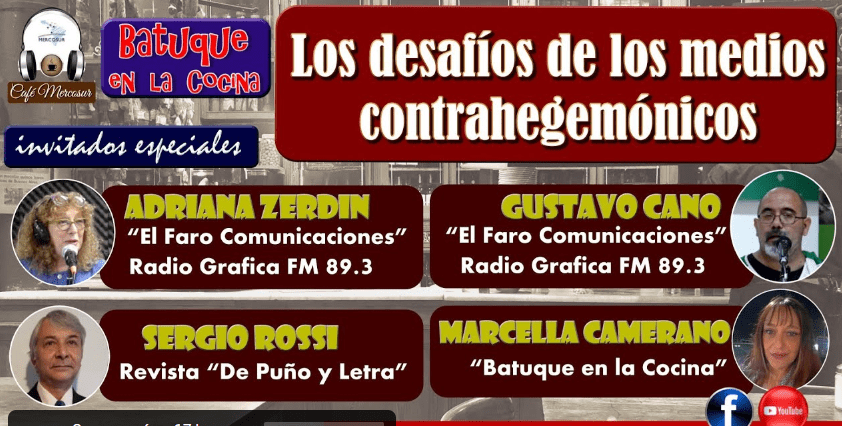 En este programa especial hablaremos de los desafíos de los Medios de Comunicación Alternativos que hacen un contrapunto al Discurso Monocorde de la Prensa Hegemónica. Para ello, contamos con la participación especial de los comunicadores sociales Adriana Zerdin Zafra y Gustavo Cano, de la Radio Gráfica y “El Faro Comunicaciones” (https://www.youtube.com/@CoopElFaro); Sergio Rossi, de la Revista “De puño y letra” (https://depunoyletraweb.com/) y la incorporación de Marcella Camerano, de Batuque en la Cocina.