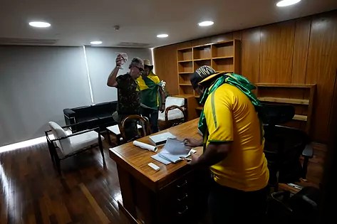 A la semana, y como culminación de un acampe de grupos bolsonaristas dentro de instalaciones militares, ante la pasividad de los mandos de las fuerzas armadas, que seguramente no habrían vacilado en actuar con extrema violencia si grupos de izquierda hubieran osado pisar sin permiso alguno de sus predios; los mismos se trasladaron en un accionar coordinado que abarcó miles de personas y un centenar de ómnibus pagos, para asaltar las sedes principales de los tres poderes del Estado Federal en Brasilia, contando igualmente con la connivencia de las fuerzas de seguridad encargadas de su custodia.