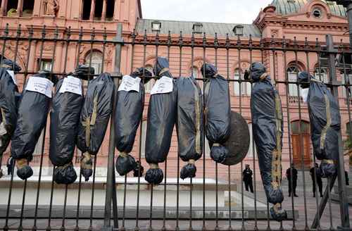 BOLSAS NEGRAS SIMULANDO CADAVERES COLGADAS FRENTE A LA CASA ROSADA, EL DIA SABADO 27 DE FEBRERO DE 2021
