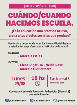 La Propuesta invita a debatir sobre el oficio de educar y es convocada por el Centro de Formación Pedagógica (Normal 3) y Amsafé Rosario.Es abierta y gratuita. La presentación estará a cargo de la Periodista Marcela Isaías, quien escribe el prólogo del libro.