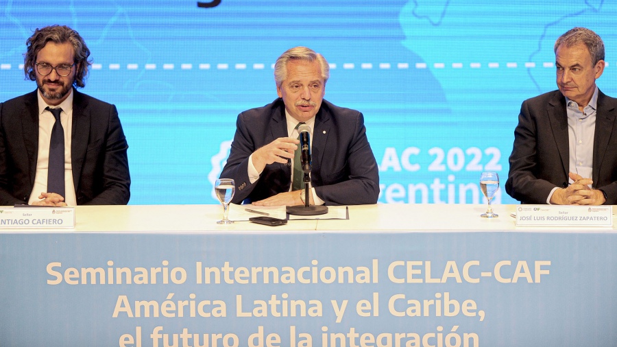 El presidente Alberto Fernández, en su rol de líder pro témpore de la Comunidad de Estados Latinoamericanos y Caribeños (C.E.LA.C.), llamó este Jueves 18 de Agosto, a «institucionalizar» al organismo y pidió «terminar» con los bloqueos sobre Cuba y Venezuela, durante el cierre del seminario internacional «El futuro de la integración: Unidad en la Diversidad», ante la presencia de los líderes latinoamericanos y del Caribe en el Centro Cultural Kirchner.