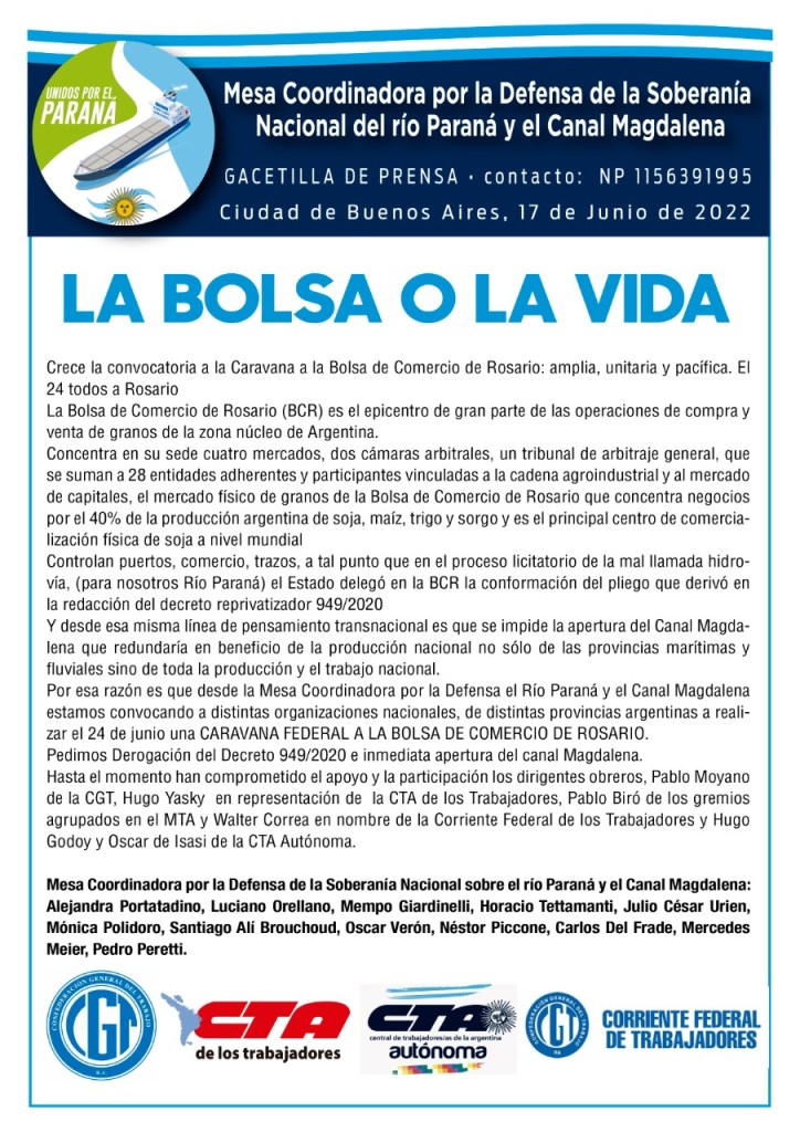 Las Centrales Obreras Unidas, en la lucha que llevan adelante por la Recuperación para el Estado, de la vía troncal de los ríos Paraná – Paraguay, la construcción del Canal de Magdalena y la Plena Reactivación de la Industria Naval.
