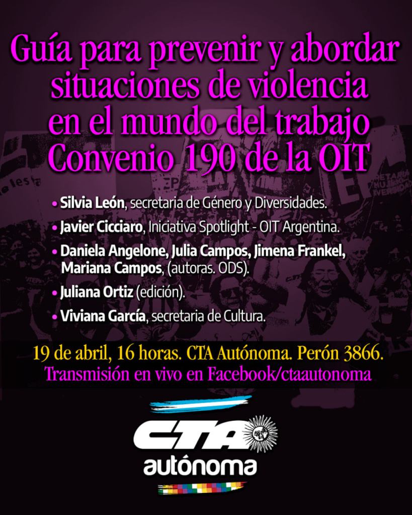 LA SECRETARIA DE GENEROS Y DIVERSIDADES Y EL OBSERVATORIO DEL DERECHO SOCIAL DE LA C.T.A. AUTONOMA INVITAN A LA PRESENTACION DE LA GUIA PARA PREVENIR Y ABORDAR SITUACIONES DE VIOLENCIA EN EL MUNDO DEL TRABAJO.