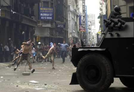 La reacción policial fue brutal. Frente a ello, muchos manifestantes volvieron a sus casas o se alejaron considerablemente de la zona de la Plaza de Mayo y de la Plaza de los Dos Congresos. Sin embargo, grupos numerosos, más activos, permanecieron en el lugar y resistieron la intervención policial. A partir de entonces se produjeron incendios, pedradas en distintos lugares de la zona céntrica. Todos los participantes de la virtual pueblada permanecían en la periferia y parte de ellos continuaban avanzando sobre la Plaza de Mayo. La situación se prolongó hasta bien entrada la madrugada. Con el correr de las horas, entrada ya la mañana y a plena luz, muchos manifestantes volvieron a congregarse en la Plaza de Mayo y el Congreso Nacional. Hacia las dos de la tarde, grupos heterogéneos convergían sobre la plaza: partidos de izquierda y la Corriente Clasista Combativa (C.C.C.) de La Matanza, marchaban hacia allí junto a oficinistas, con sus trajes y maletines. Media hora más tarde y aunque la situación era tranquila, la Policía Federal intervino nuevamente. Primero se escucharon sirenas. Luego llegaron carros de asalto y se armó la primera fila de la Guardia de Infantería con cuya intervención comenzó la represión. Se trató de una reacción de violencia extrema frente a un conjunto de personas que, al tiempo de la intervención policial, manifestaban pacíficamente. Frente a ello, algunos grupos reaccionaron arrojando piedras, palos y adoquines contra los agentes policiales y contra algunos edificios públicos o bancos. Los tachos de basura y los bancos de la plaza fueron incendiados y con ellos se montaron barricadas. Todos corrían, hacia un lado y otro. Una hora más tarde, la policía había logrado montar su centro de operaciones en Rivadavia y Entre Ríos. Los manifestantes habían quedado repartidos en varias esquinas. Mientras la policía reprimía a los manifestantes frente al Congreso Nacional, a sólo dos cuadras de allí eran devastados varios comercios. Estos enfrentamientos urbanos se sucedieron hasta la noche.
