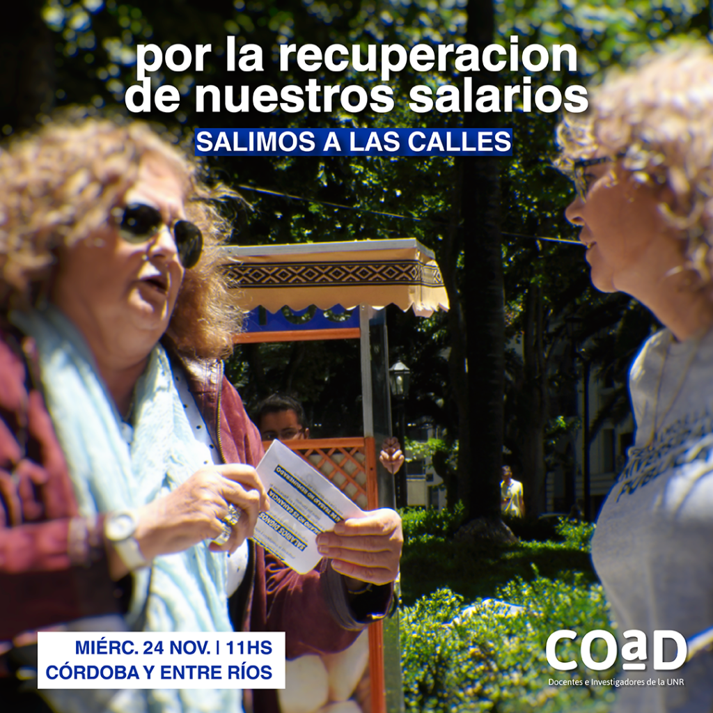 En este contexto, y a las puertas de la instancia de revisión salarial estipulada en el último acuerdo paritario para diciembre, la última asamblea de COAD resolvió realizar esta jornada de difusión por la recuperación salarial, a la que convocamos a toda la docencia y la comunidad universitaria. Explicar y denunciar de cara a la sociedad nuestra situación salarial y exigir políticas de Gobierno para avanzar en mayores derechos para todxs lxs trabajadorxs es el camino elegido para fortalecer nuestras demandas.