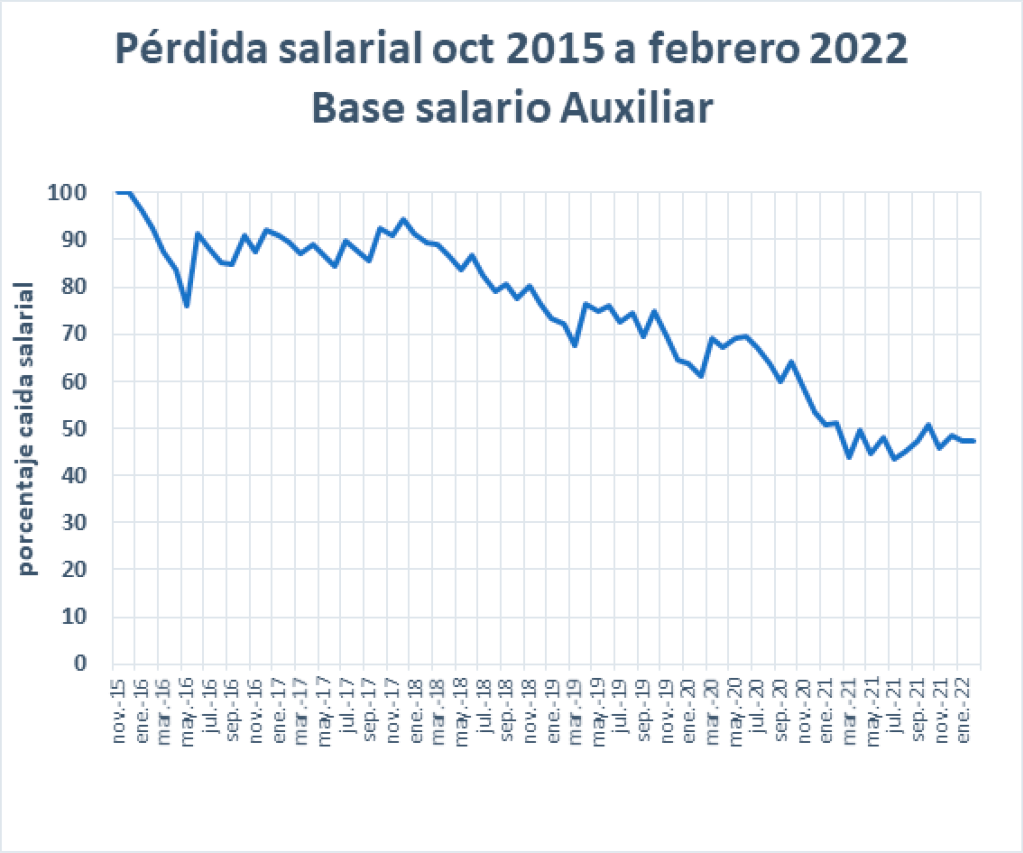 El Gráfico ilustra la pérdida en el poder adquisitivo del salario docente durante los últimos 6 años. Tomando como punto de partida octubre de 2015, abarcando completo el Gobierno de Cambiemos y lo que lleva del Gobierno Actual, la rebaja es de un 45,9% a noviembre de 2021. Si hablamos de Masa Salarial, es decir cuanto perdimos mes a mes de Poder Adquisitivo en todo el período señalado, el monto es equivalente a 18 SUELDOS (tomando como referencia el Salario de Noviembre de 2021).