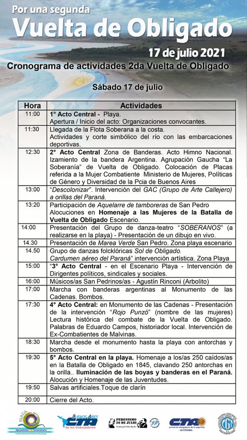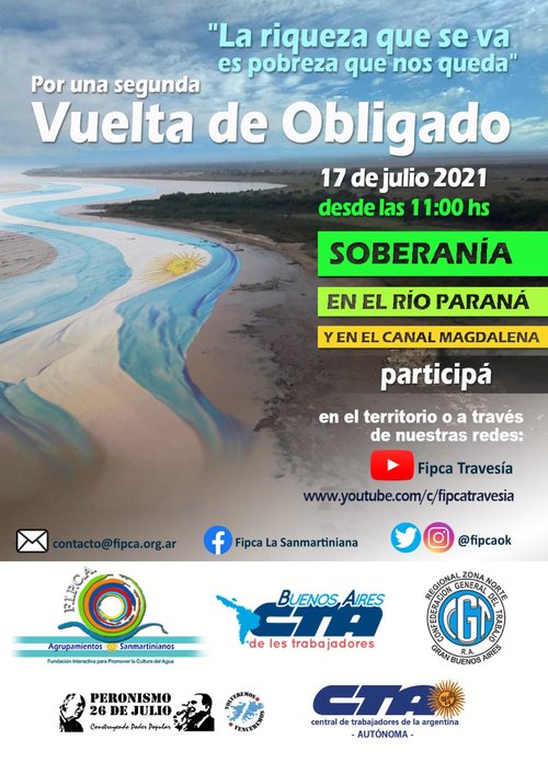 El sábado 17 de julio de 2021, a partir de las 11:00, la CTA de lxs Trabajadorxs estará presente junto a organizaciones del Campo Nacional y Popular Organizado en el sitio Histórico de Vuelta de Obligado, sobre la costa del Río Paraná (San Pedro, Provincia de Buenos Aires). En reclamo por la «soberanía en la Vía Troncal del Paraná y el Canal Magdalena», ya que «la riqueza que se va es la pobreza que nos queda».