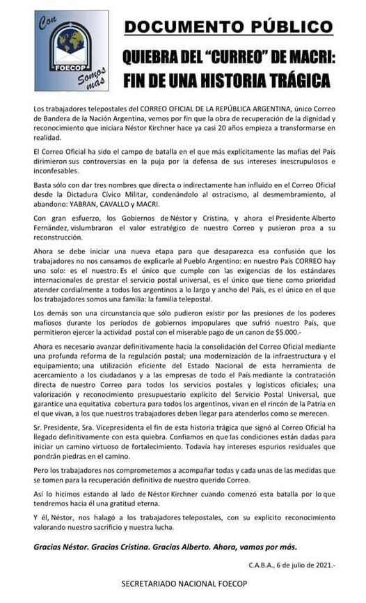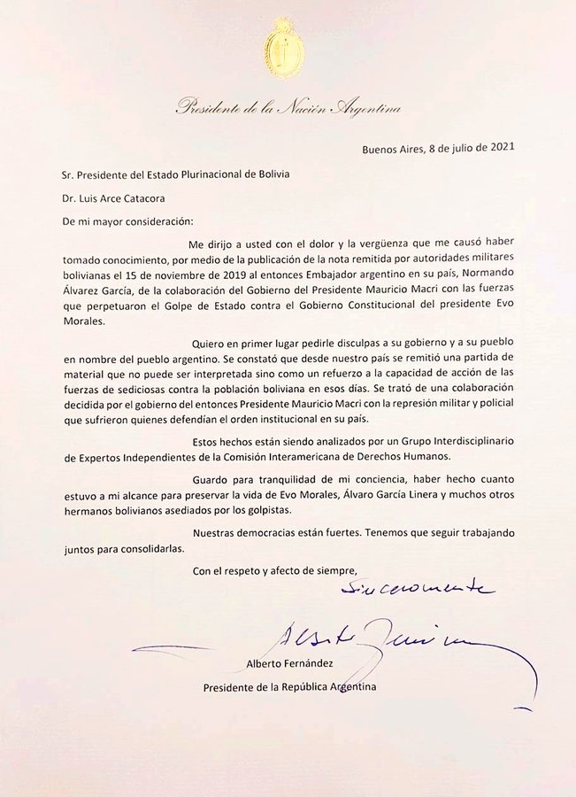 «Repudiamos el apoyo del gobierno del ex-presidente de la República Argentina, Mauricio Macri, al Golpe de Estado que vivimos el año 2019 en el Estado Plurinacional de Bolivia. El envío de material bélico para reprimir al pueblo boliviano contraviene las normas internacionales»