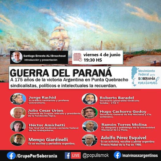 En el año 1845 la Confederación Argentina, fue bloqueada por los dos imperios más importantes del mundo. Inglaterra y Francia en sus proyectos de expansión comercial, y con los objetivos de terminar con cualquier decisión política soberana, incursionan sobre nuestros ríos interiores con el propósito de imponer la prepotencia imperial a los gobiernos en esta región sur del continente americano.
