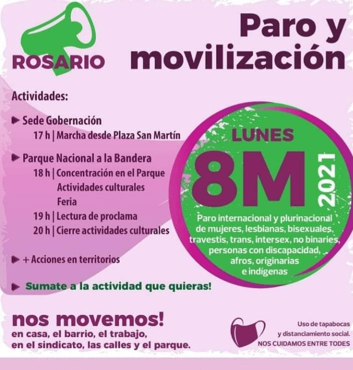 Agenda de actividades del 8M 📌 Las mujeres y disidencias paramos 24hs. la UNR. 📌 12hs.: Radio Abierta de la Intersindical de Mujeres Rosario frente al Concejo Municipal 📌 13hs. Intervenciones en la Facultad de Ciencias Económicas y Estadísticas 📌 16hs. Intervenciones en la Fac. de Ciencias Exactas, Ingeniería y Agrimensura 📌 18hs. Concentramos en el monumento a la bandera.