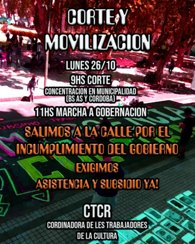Nueva movilización de LXS TRABAJADORXS DE LA CULTURA este Lunes 26 de Octubre. Concentración y Corte de Calle a las 9 hs. frente a Municipalidad de Rosario, para luego marchar a las 11 hs hacia la Sede de la Gobernación de la Provincia de Santa Fe.