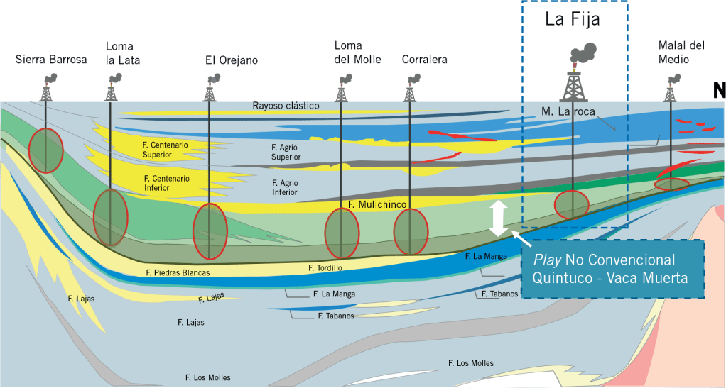 CORTE SUR A NORTE DE LA CUENCA NEUQUINA, DONDE SE INDICA LA SECCIÓN SEDIMENTARIA, EN LA CUAL SE PODRIA REALIZAR EXPLOTACIÓN DE TIPO NO CONVENCIONAL.