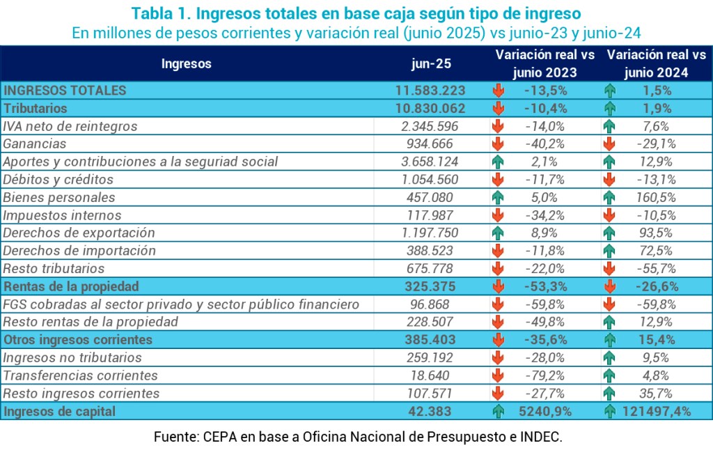 Incremento Real en los Ingresos: los ingresos totales alcanzaron $11,58 billones, observando una un alza interanual de 1,5% en términos reales (compensó la finalización de la vigencia del Impuesto PAIS), aunque, en comparación con junio 2023, se redujeron 13,5% en términos reales. Los ingresos tributarios se incrementaron 1,9%, al ser impulsado por el aumento de 93,5% en Derechos de Exportación (último mes con la reducción en las retenciones), 72,5% en Derechos de Importación, 12,9% en Aportes y contribuciones a la seguridad social y 160,5% en Bienes Personales (en 2024 se había prorrogado el pago a agosto y septiembre). Por su parte, la recaudación del IVA se incrementó 7,6% i.a., siendo un dado relevante al ser el impuesto más significativo del sistema tributario