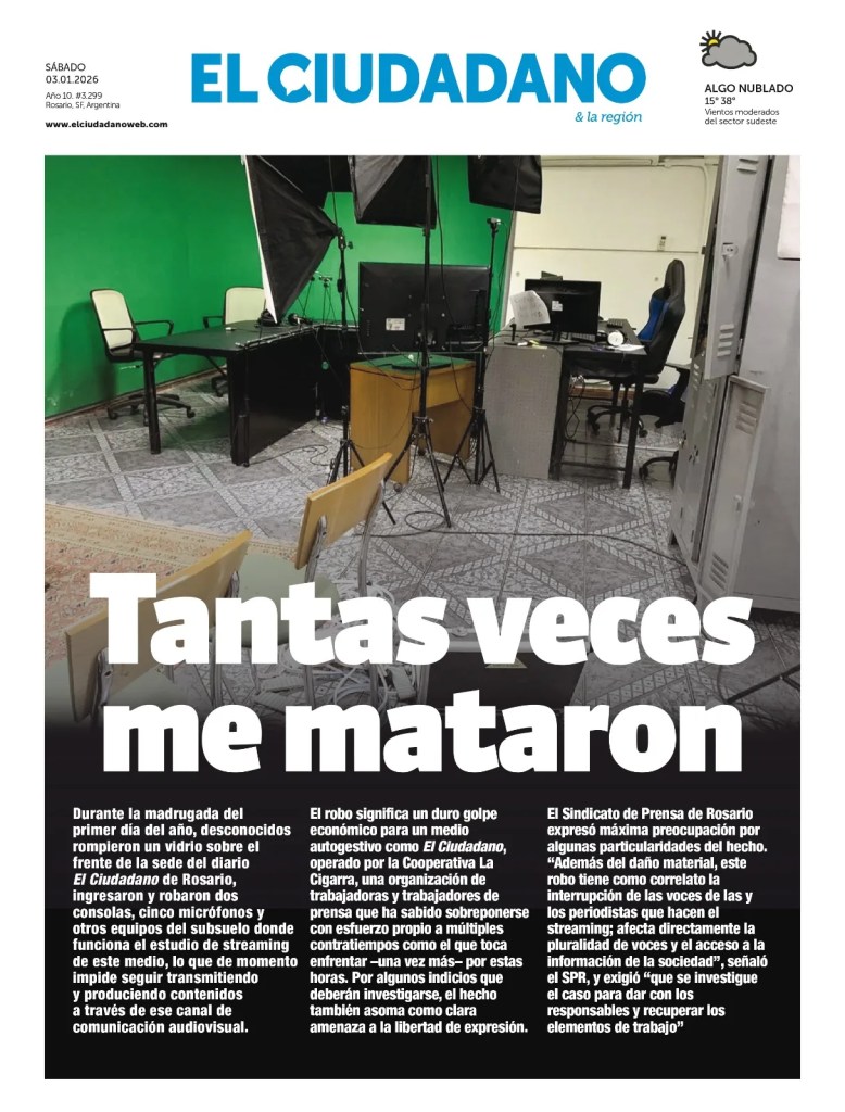 Fue un triste comienzo de 2026 para el diario El Ciudadano. Durante la madrugada del primer día del año, desconocidos rompieron un vidrio del frente del edificio e ingresaron al diario. Se dirigieron directamente al sótano donde funciona el streaming y se llevaron las dos consolas de sonido, todos los micrófonos, lo que nos impide seguir transmitiendo y filmando. Este robo, además de representar un desastre dentro de nuestra magra economía ya que este diario es una cooperativa que se sostiene con el esfuerzo de sus trabajadoras y trabajadores, es también un atentado contra la libertad de expresión ya que no nos permite desarrollar nuestro trabajo. Nos llama la atención lo selectivo del robo y lo simbólico del hecho de que se hicieran con los micrófonos.