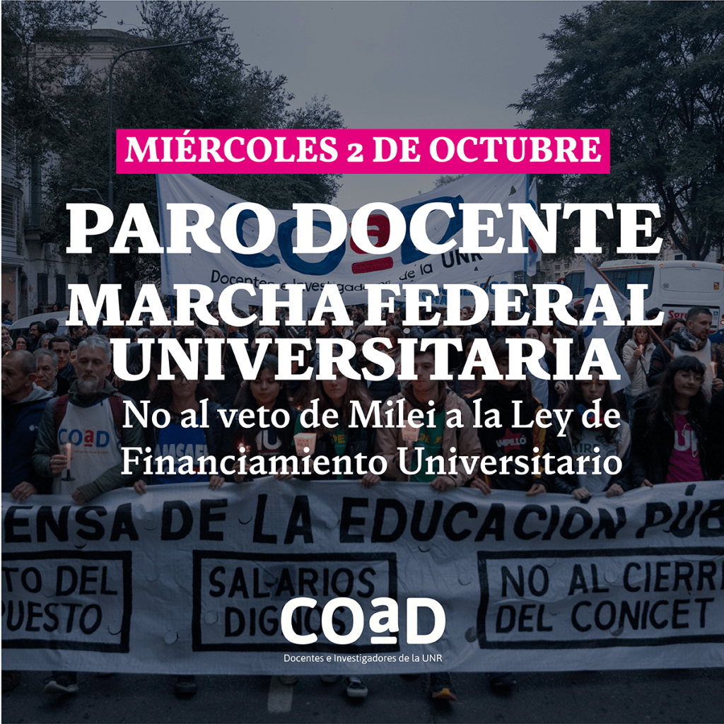 El Viernes 27 de septiembre, el Congreso de Delegadxs reunido en la Sede Gremial de COAD resolvió convocar a Paro Docente Universitario para el día de la Marcha Federal Universitaria.