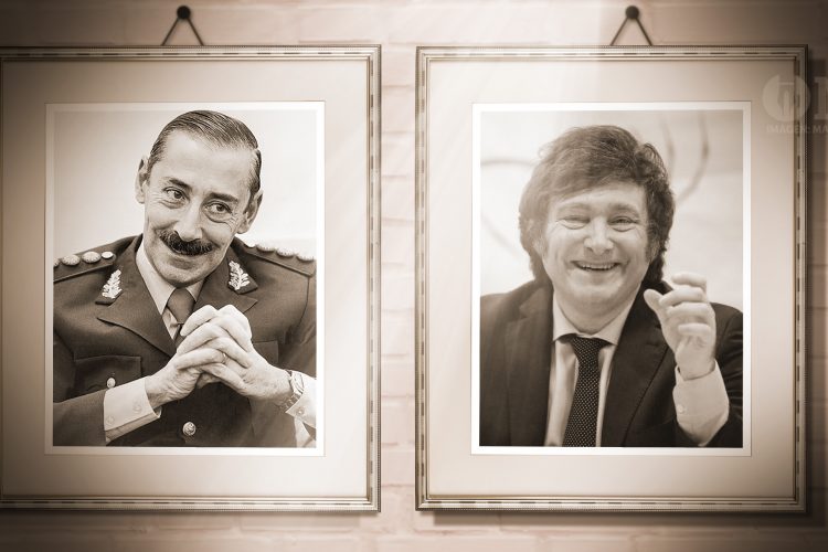 SE LOS VE MUY FELICES A ELLOS POR LA APLICACION DE SUS POLITICAS SALVADORAS PARA LA VIDA DE LOS ARGENTINOS. VIDELA CON FRASE MAS CELEBRE: «LOS ARGENTINOS SOMOS DERECHOS Y HUMANOS» Y MILEI CON SU: «VIVA LA LIBERTAD, CARAJO»