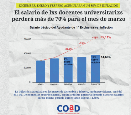 A CONTINUACION SE PUEDE OBSERVAR EL DETERIORO DEL SUELDO DE UN TRABAJADOR DOCENTE QUE SE DESEMPEÑA EN EL AMBITO DE LA UNIVERSIDAD PUBLICA, SEGUN UN RELEVAMIENTO DE LA COAD: