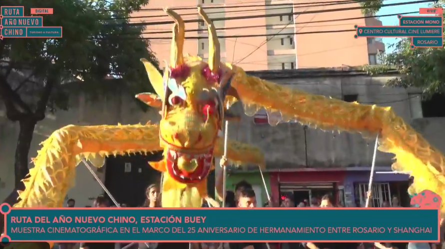 MOMENTO EN EL CUAL EL DRAGON DORADO DEL BARRIO CHINO DE LA CIUDAD AUTONOMA DE BUENOS AIRES, REALIZA EN SIGNO DE RESPETO AL CENTRO CULTURAL «CINE LUMIERE» TRES REVERENCIAS Y LUEGO COMPLETA CON UN SHOW DE DANZA DEL DRAGON Y EL LEON -ESCUELA LUNG CHUAN- FESTEJANDO EL AÑO DEL CONEJO EN LA CIUDAD DE ROSARIO EL DIA DOMINGO 26 DE ENERO DE 2023.