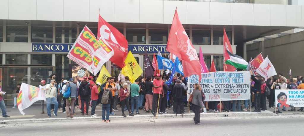 ACTO CONVOCADO POR ARGENTINOS PARA LA VICTORIA JUNTO A LAS PRINCIPALES CENTRALES SINDICALES (CUT, Força Sindical e CTB) EN LA CIUDAD DE SAO PABLO -REPUBLICA FEDERATIVA DE BRASIL- MUÑECO DE JAVIER MILEI EN PLAZA DEL CONGRESO, PARTICIPANDO DEL PARO Y MOVILIZACION CONTRA EL D.N.U., EL PROYECTO DE LEY «OMNIBUS» Y EL PROTOCOLO DE BULLRICH -FOTOGRAFIA: laizquierdadiario.com-