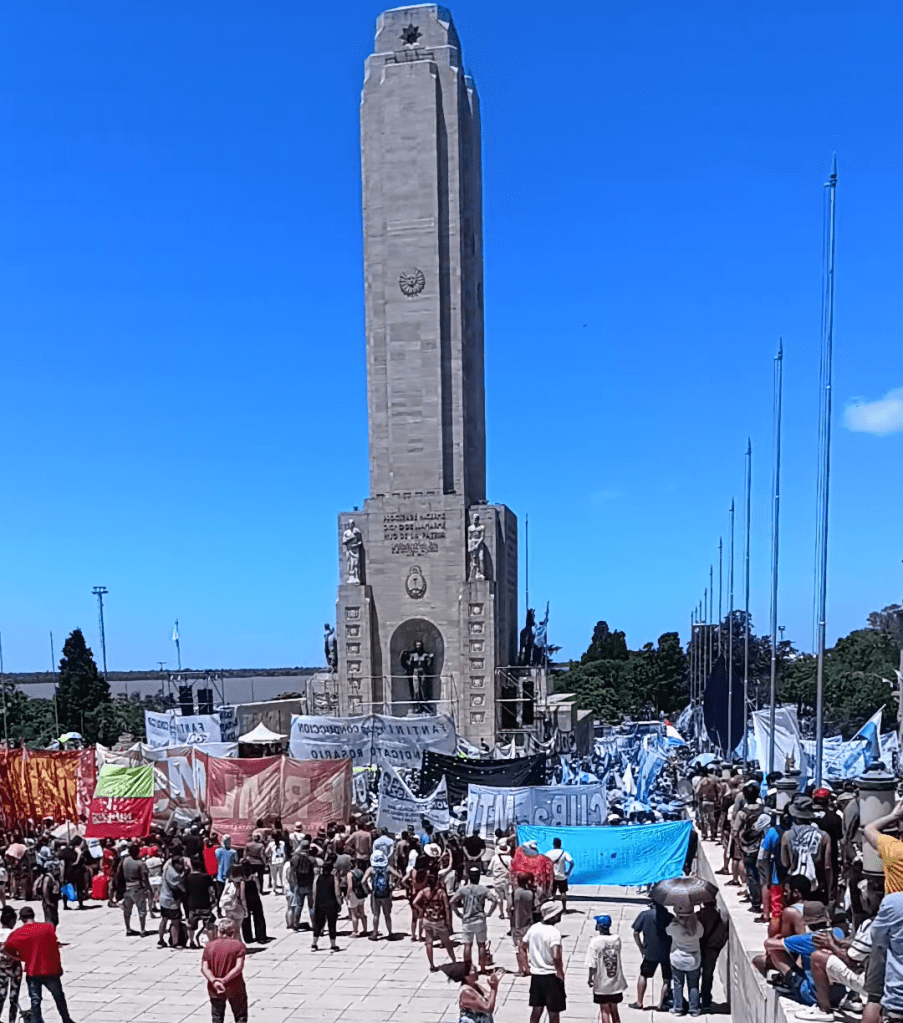 EL PUEBLO ROSARINO SE VOLCO MASIVAMENTE A LAS CALLES DESBORDANDO EL MONUMENTO NACIONAL A LA BANDERA CUYO INGRESO POR EL PROPILEO SE HALLA CERRADO POR REFORMAS, DE ESTA MANERA LA CONCURRENCIA OCUPABA VARIAS CUADRAS POR LA CALLE CORDOBA MAS LAS COLUMNAS QUE SE UBICARON POR LA AV. BELGRANO.