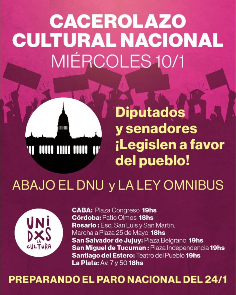 El Miércoles 10 de Enero a las 18:00 Horas Marchamos desde la Plaza Montenegro hasta la Plaza 25 de Mayo en contra del D.N.U., la Ley Omnibus y el Protocolo Antipiquetes que buscan desfinanciar y Destruir Nuestra Cultura. Acercate a hacer ruido!
