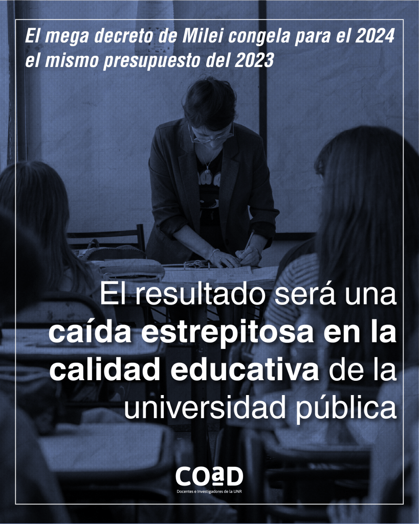 El Decretazo interviene, como era de esperar, en el (des)financiamiento de la Universidad Pública Nacional. En un contexto de shock devaluatorio e inflacionario se prorroga para 2024 el presupuesto 2023. Esto significa un ajuste brutal que pone en peligro el funcionamiento de la universidad, afectará a la calidad académica y seguramente impondrá una mayor precarización en las condiciones de trabajo y estudio.