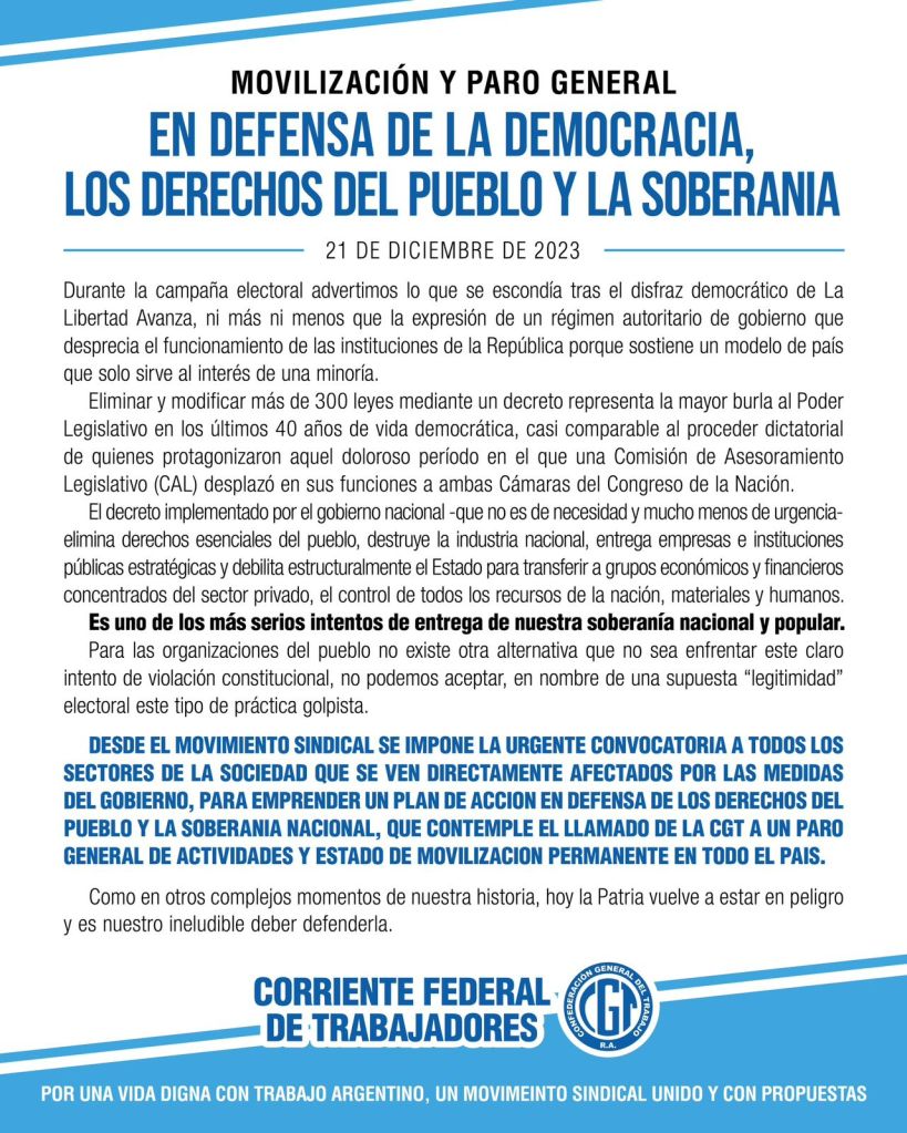 El Gobierno de Milei no se hizo esperar para mostrar su carácter antipopular y extranjerizante: en 10 días de mandato ya atacó de forma contundente los ingresos populares, amenazó y Reprimió la Protesta Social y vulneró las instituciones democráticas con un D.N.U. que modifica y/o deroga más de 300 Leyes y que implica la entrega del Patrimonio Nacional, la perdida de Derechos Laborales y un ataque contundente a la Salud y al Derecho a la Vivienda (entre muchas otras cosas). 22 años después del levantamiento popular del 19 y 20 de diciembre de 2001, muchas de las mismas figuras políticas de ese momento entre las que destaca Patricia Bulrrich, quieren imponernos nuevamente un programa neoliberal a base de represión y autoritarismo.